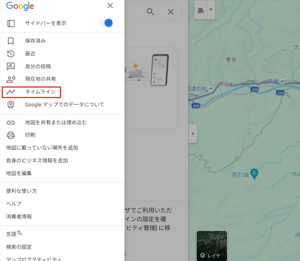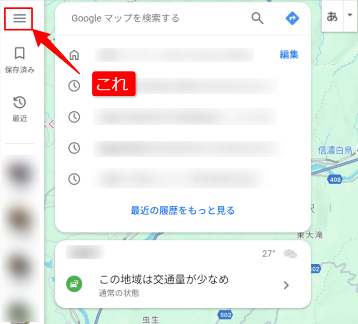 パソコンでGoogleマップを開き、左上の三本横線をクリック